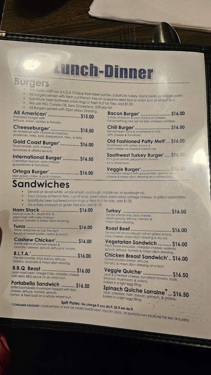 Salads are well represented with selections including Cobb salad, cashew chicken salad sandwich, shrimp salad, and Grover’s salad, providing lighter meal choices. Sandwiches and burgers form a significant portion of the menu, with offerings such as the Monte Cristo, Portabella sandwich, pastrami sandwich, Botana chicken sandwich, and multiple burger varieties that include the All American, International, Ortega, and Gold Coast burgers, usually served with fries or side salads.
